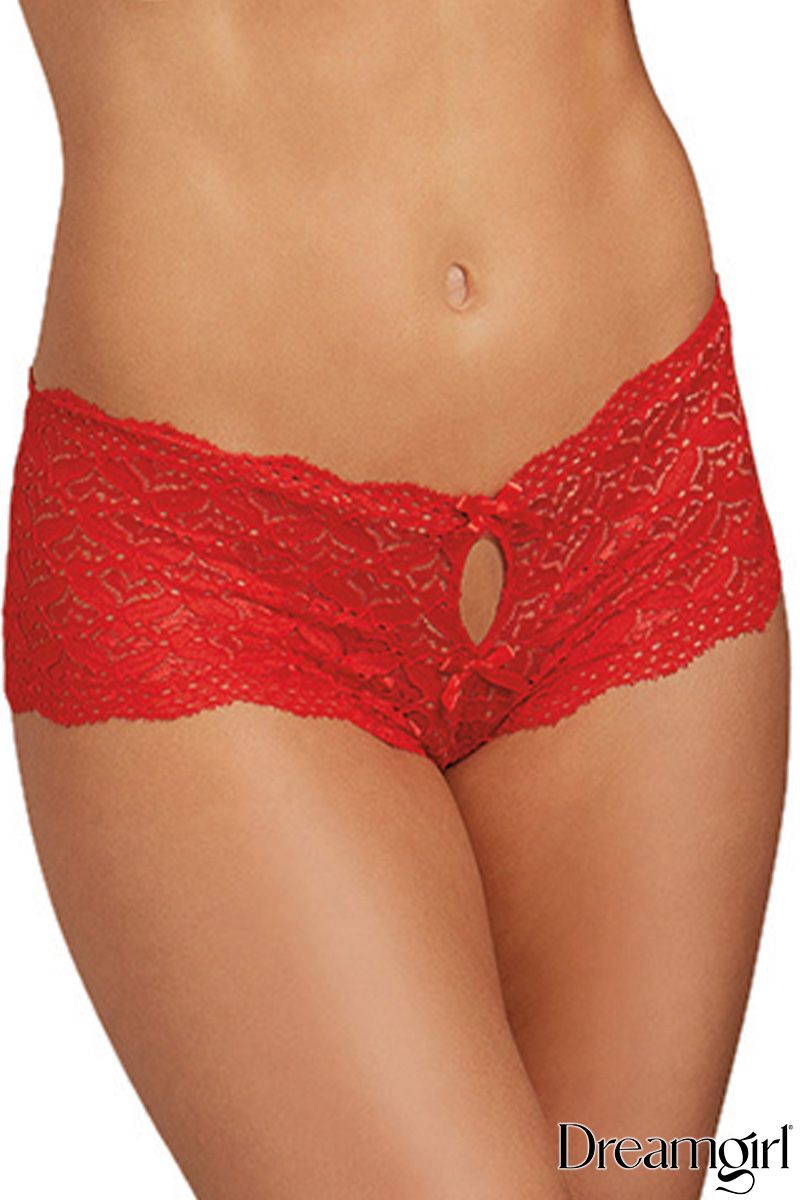 Stretch lace panties with openwork heart pattern at the back, open crotch. Available in sizes S to XL, also in plus sizes (1X-3X). Composition: 90% nylon, 10% spandex. Colors: red, white. Reference: DG1442 / DG1442X. Discreet delivery in a box.