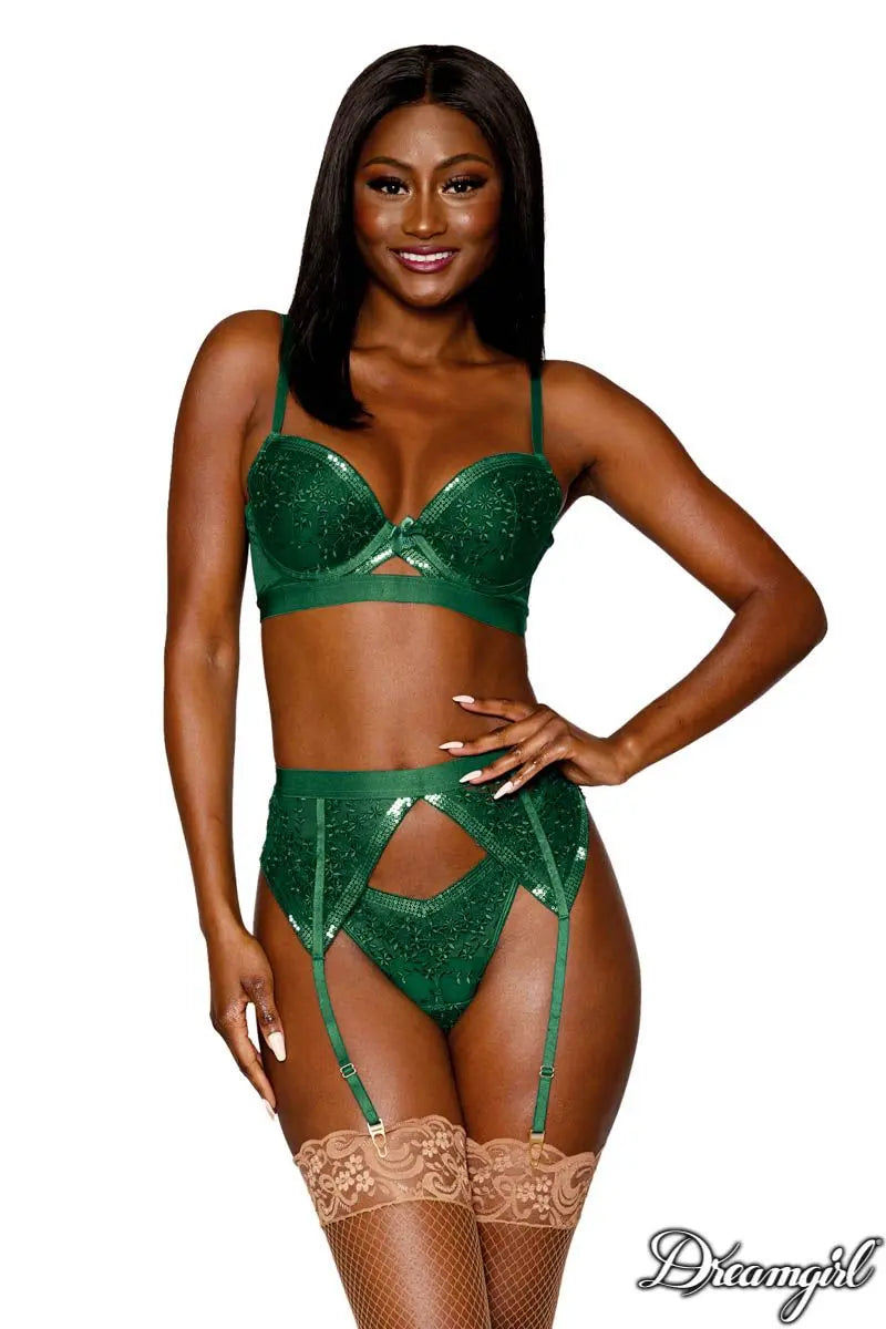 Élégant ensemble trois pièces alliant brillance et finesse. Le soutien-gorge à armatures et bonnets légèrement rembourrés est recouvert de paillettes lumineuses pour une touche glamour. Les bretelles ajustables et la fermeture à crochet au dos assurent un ajustement confortable. Le porte-jarretelles brodé à taille haute met en valeur la silhouette grâce à sa ceinture élastique, ses jarretelles dorées réglables et sa fermeture discrète à l’arrière. Le string brodé en maille transparente complète harmonieusement l’ensemble. Bas DG0001 vendus séparément.